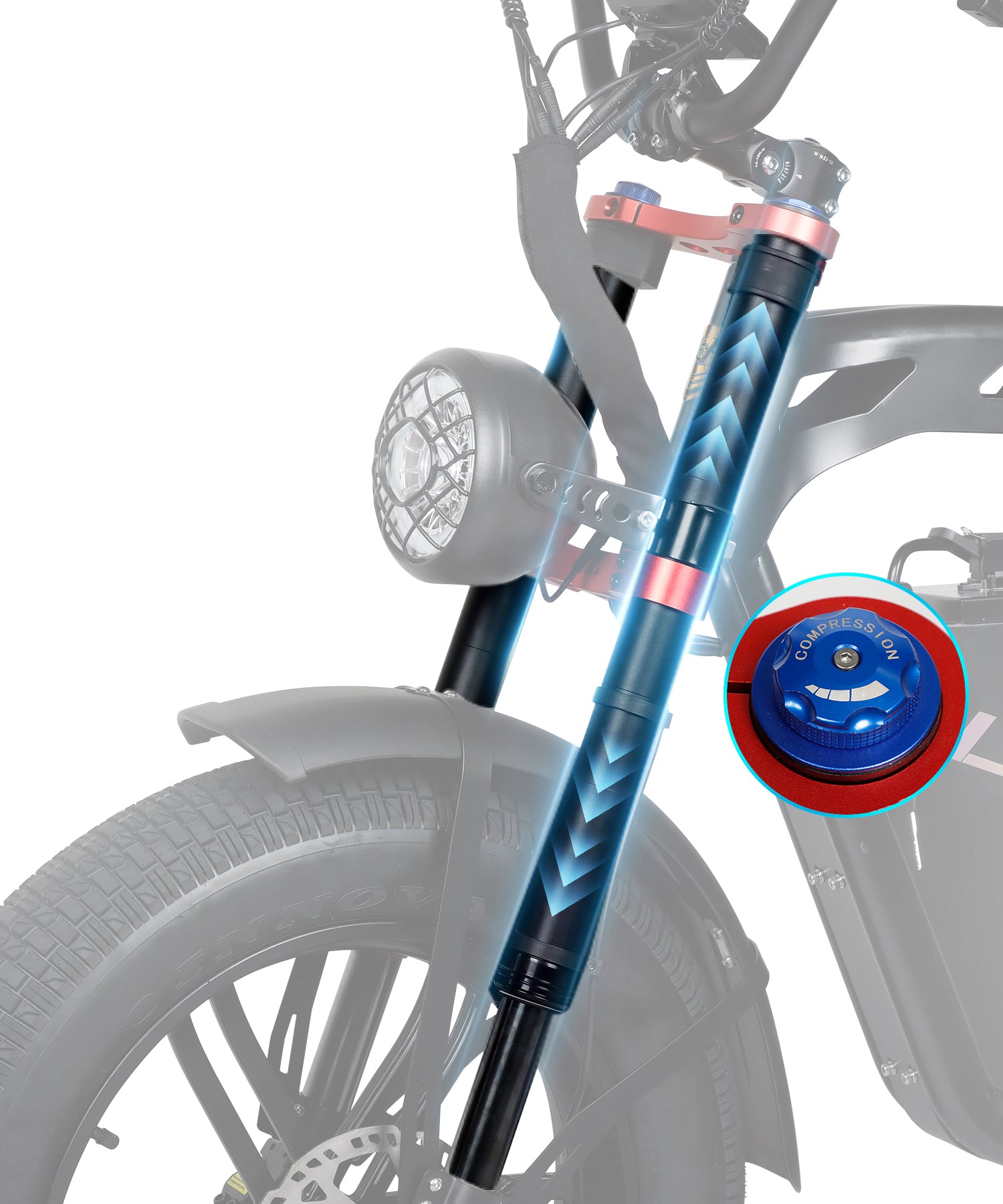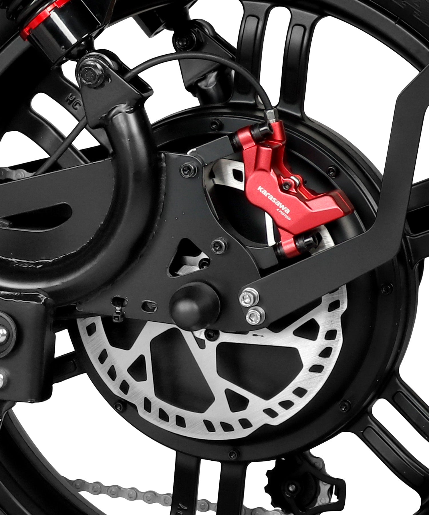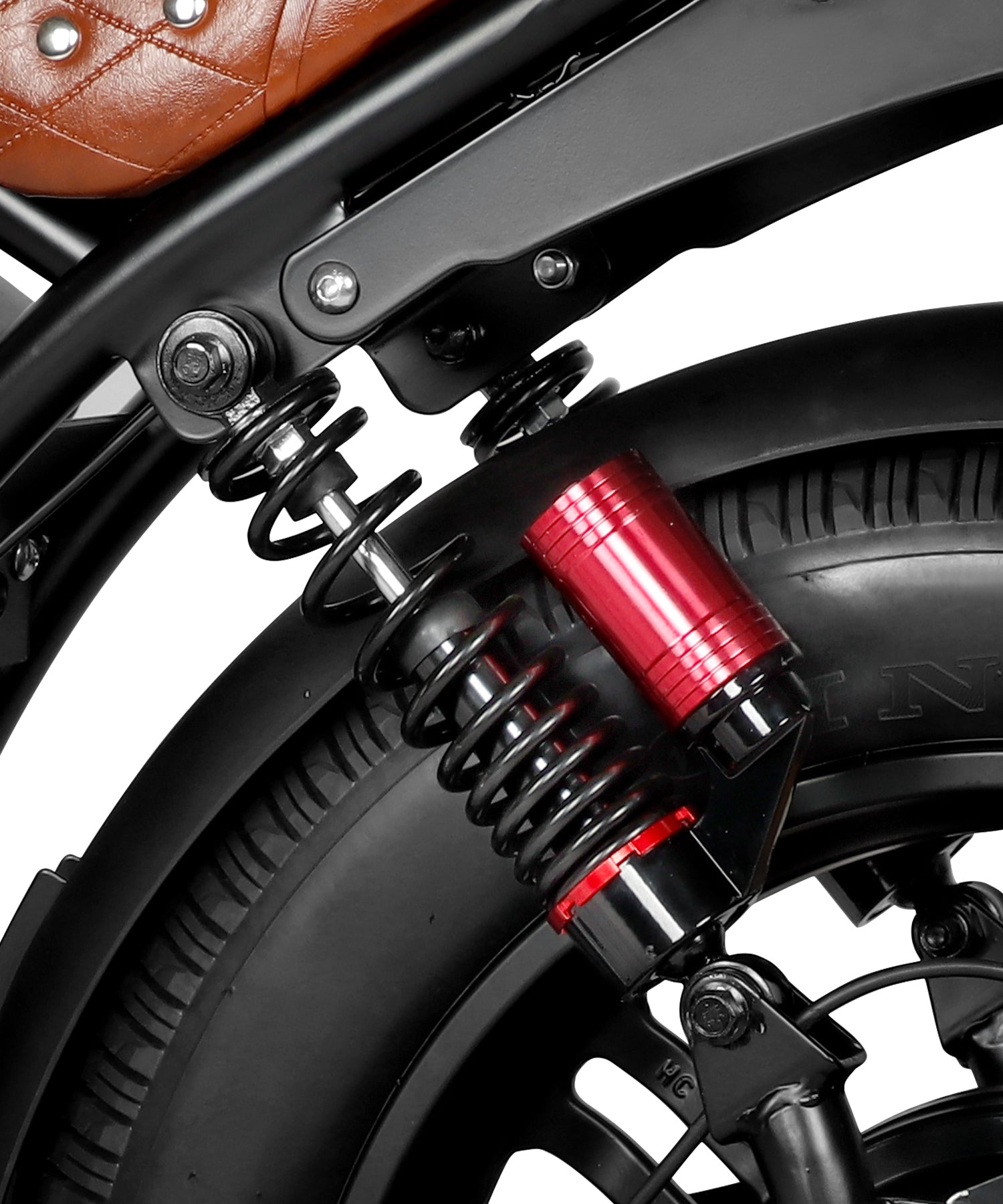 Inspired by motorcycle suspension design, the dual rear shocks offer superior comfort and stability. With two shock absorbers, the system effectively handles bumps, delivering a smoother ride. Whether on asphalt, dirt, or rocky trails, this design ensures optimal performance and a more controlled ride.