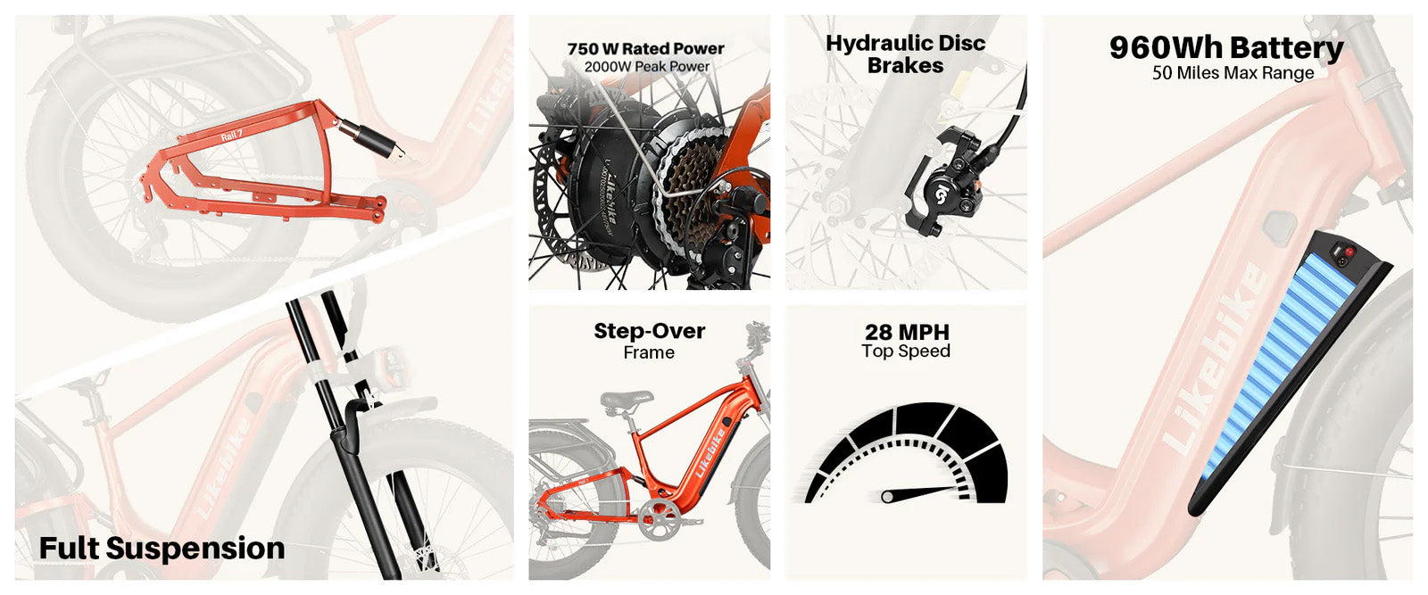 50 miles long range and fat tire electric bike with 26" x 4" fat tires for adults.