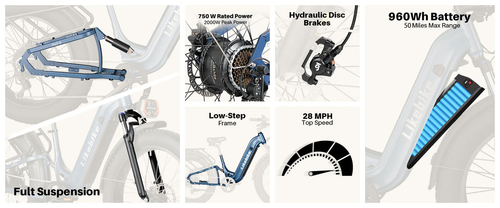 The Rail 6 ebike seamlessly combines unparalleled performance with a classic design. It is equipped with a powerful 2000W peak motor and a 48V 20AH high-capacity built-in removable battery. It can reach a top speed of 28 MPH. In pedal-assist mode, it offers a range of up to 50 miles. It also features front fork suspension and rear shock absorption, effectively absorbing impacts during riding. Whether on flat roads or rugged mountain trails, it handles with ease, taking you wherever you want to go.